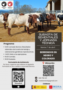 El evento comenzará a las 13:00 horas con la jornada técnica, donde se presentarán las evaluaciones genéticas reproductivas y los resultados de la serie de testaje. A continuación, los asistentes podrán visitar los animales, compartir un tiempo de convivencia durante la comida y, finalmente, participar en la subasta prevista a las 16:00 horas. Os dejamos en la siguiente imagen el cartel informativo de la jornada del 7 de abril.